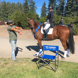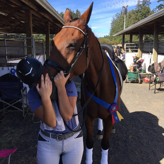 Mobius Strip, the 10-year-old off the track TH began his show career debuting at first level this season. Not only have we worked hard on packing on the pounds and muscle, but we had a few behavioral kinks to work out as well. He was quite the distracted, spicy ride! Heart of the Valley was our first time getting his hooves wet, and for how silly this boy can be, having mid/low 60s% with no major airs above the ground was a total win. Since May, lots of developments have been made in his training. I have included a picture of him showing what a TH project he was in his early months of training. Well, this little project horse has proved he can shine in the dressage ring! 67.9%, 66%, and 68%! Janet could not be a more perfect owner/rider for him, and she could not be a more perfect student to have! It is my pleasure get to show this little cutie off in the show ring and teaching him how to be a dressage horse! Hope to see these two in the ring together in the years to come.